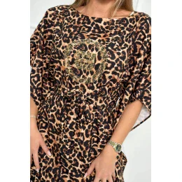 Predstavujeme vám módne šaty. Šaty majú netopierie rukávy. Módna leopardia potlač. Šaty zaviazané v páse. Ideálna každodenná poloha. Šaty sú vyrobené z vysoko kvalitného materiálu. Veľkosť je univerzálna a vyhovuje dámam, ktoré nosia veľkosť S, M alebo L.