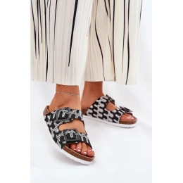 Vzorované dámske papuče z textilného materiálu umiestnené na korkovej platforme, ktoré spájajú pohodlie s módnym vzhľadom. Dva remienky s prackami zdobené flitrami im dodávajú výnimočný charakter. Tvarovaná semišová stielka poskytuje pohodlie počas celého dňa. Tieto papuče budú skvelou voľbou na letné dni, dokonale sa hodia k šatám, sukniam alebo šortkám a každému outfitu dodajú ľahkosť a lesk.
