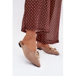Dámske papuče mule z ekokože sú štýlovým dizajnom s elegantným charakterom. Krytá špicatá špička dodáva modelu klasický tvar a veľký zlatý detail na prednej strane je pútavým doplnkom. Plochý podpätok zaručuje pohodlie pri nosení. Model dokonale doplní elegantné aj ležérne oblečenie.
