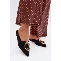 Dámske sandále typu mule z eko semišu sú štýlovým dizajnom s elegantným charakterom. Krytá špicatá špička dodáva modelu klasický tvar a veľký zlatý detail na prednej strane je pútavým akcentom. Plochý podpätok zaručuje pohodlie počas nosenia. Model dokonale doplní elegantné aj ležérne oblečenie.