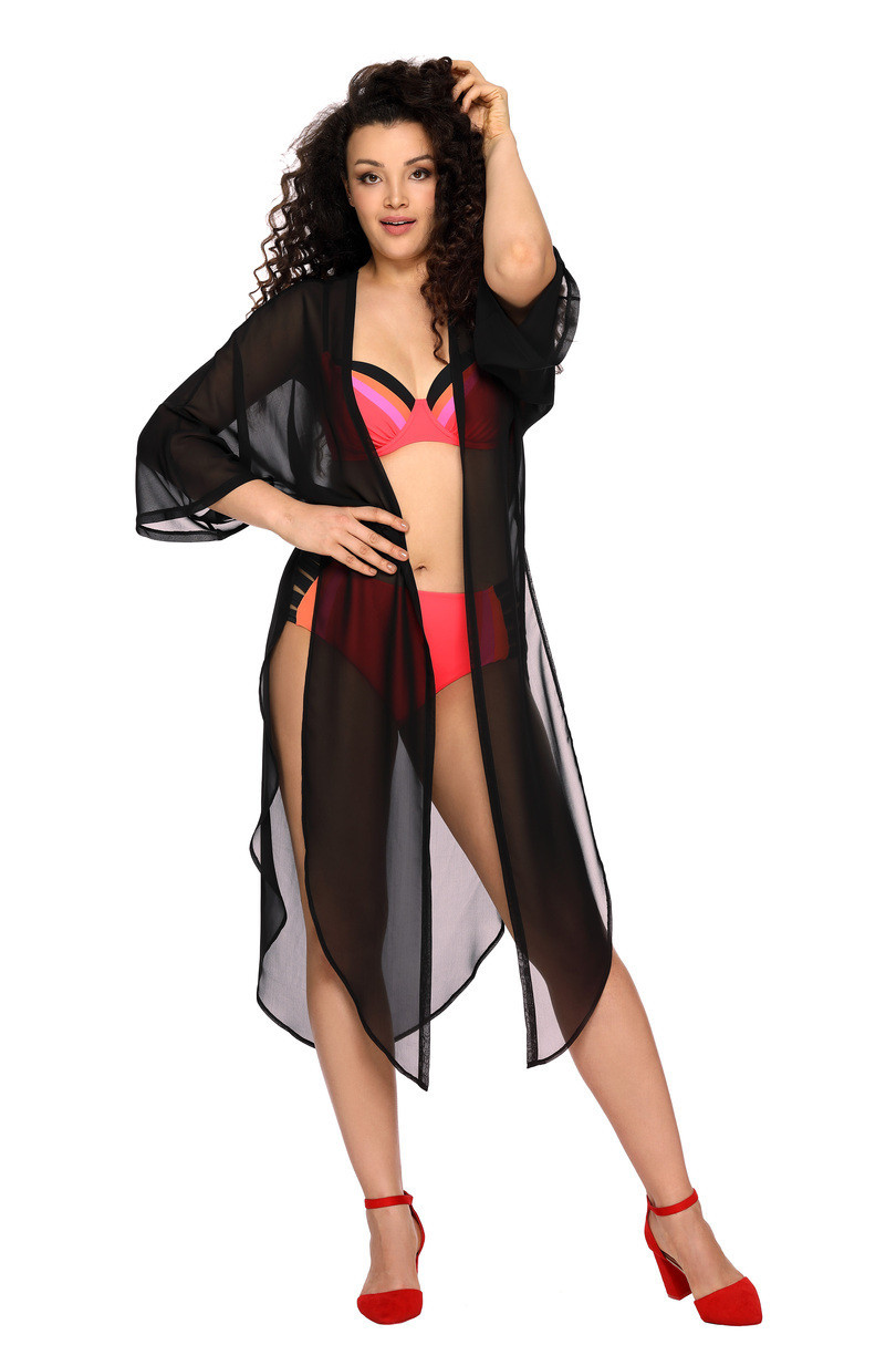 Uzupełnienie plażowego stroju w postaci uwodzicielskiej, szyfonowej, półdługiej narzutki z luźnym rękawem. Zakryje ewentualne niedoskonałości figury, ale też ochroni przed słońcem. Rozcięcia po bokach sięgające talii pozwalają na wyeksponowanie nóg i bioder, a w razie potrzeby przednią część można potraktować jako finezyjne wiązanie. Klasyczna transparentna czerń to elegancja sama w sobie.