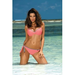 Hladké dvojdielne plavky so vzorovaným lemovaním a skvelými farbami. Veľmi ženské. Košíčky podprsenky boli profesionálne tvarované a vystužené - dobre zbierajú prsia, nadvihujú ich a vďaka kosticiam a push-up vypchávkam ich ešte opticky zväčšujú. Hlboký výstrih - mierne hlboký, ale napriek tomu veľmi elegantný a vyvážený. Ramienka sú nastaviteľné. Pásik sa pohodlne zaväzuje na chrbte. Nohavičky sa zaväzujú na bokoch. Plavky vyzerajú naozaj skvele a na pláži sa budete cítiť úplne pohodlne.