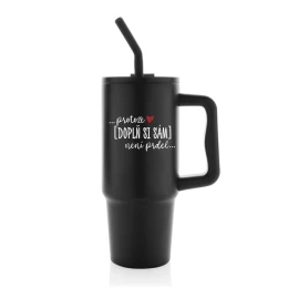 Když malý nestačí. Tento extra velký cestovní hrnek o objemu 900 ml je navržen pro všechny, kteří chtějí mít pořádnou dávku kávy, čaje nebo vody stále po ruce. A navíc s vlastním textem – jménem, mottem, vtipem nebo hláškou, která tě vystihuje.
