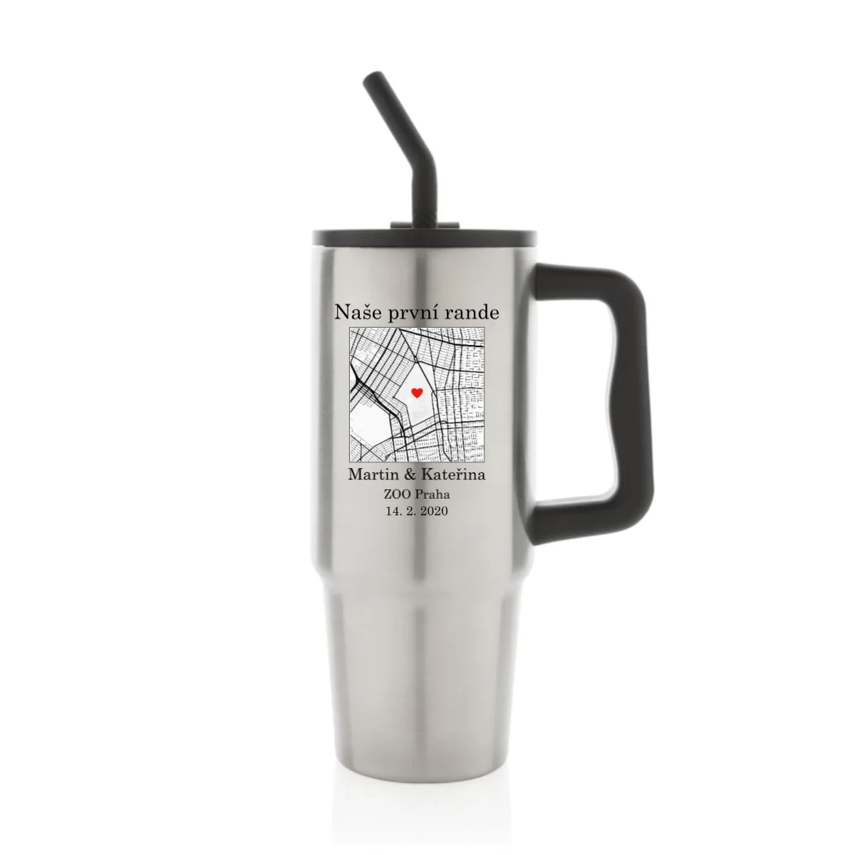 Hledáte originální dárek nebo něco, co bude opravdu Vaše? Tento velký cestovní hrnek (900 ml) spojuje praktičnost s emocemi. Vyberte si mapu místa, které má pro Vás zvláštní význam – třeba místo prvního rande, výletu snů nebo jiné vzpomínky. Na mapě označíte přesnou adresu, přidáte dvě jména a vlastní popisek – a vznikne jedinečný hrnek, který bude mluvit za Vás.