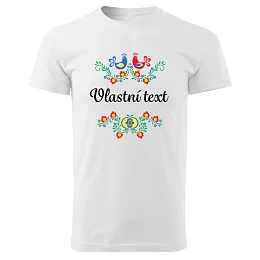 Stylové tričko inspirované moravským folklorem, které kombinuje tradiční lidové ornamenty s možností vlastního textu. Barevný motiv s ptáčky a květinami připomíná klasické lidové výšivky a přináší na tričko kousek moravské tradice.