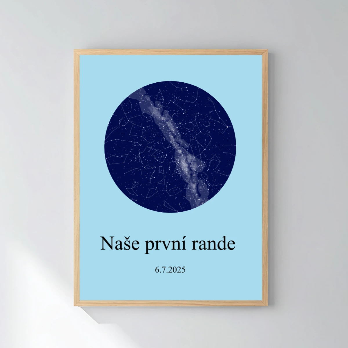 Vytvořte jedinečný obraz hvězdné oblohy přesně tak, jak vypadala v konkrétní chvíli a na konkrétním místě. Stačí zadat adresu a datum – my podle nich vygenerujeme autentickou hvězdnou mapu, která zachytí výjimečný okamžik Vašeho života. Výsledkem je osobní a nadčasový doplněk interiéru nebo krásný dárek k narozeninám, výročí, svatbě či narození dítěte.