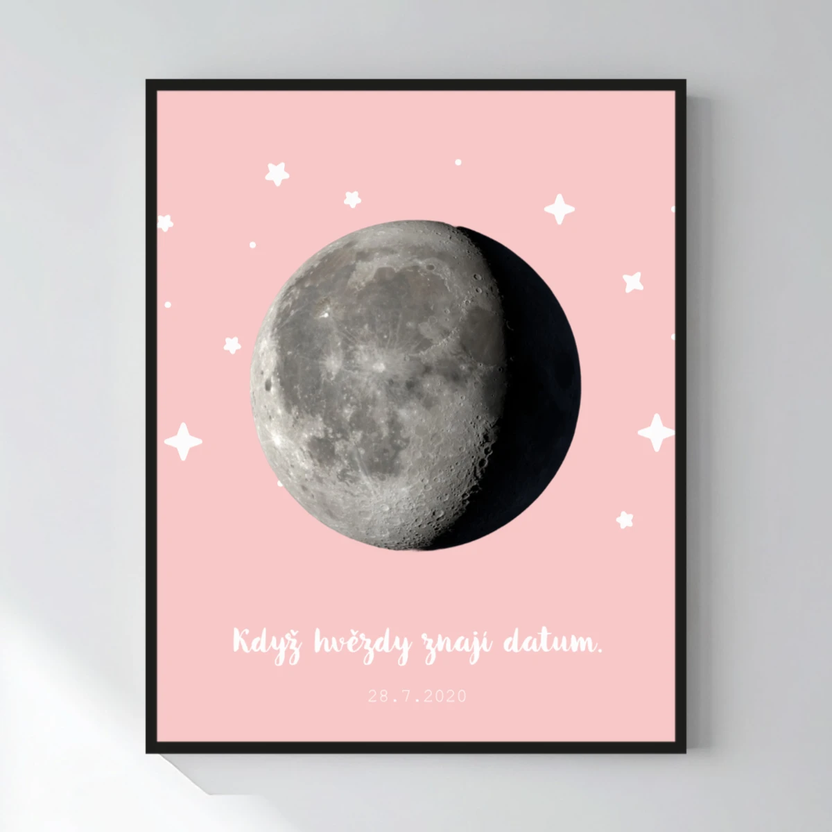 Datum, které změnilo všechno. Obloha, která ho nese. Na základě zvoleného data se na plakátu zobrazí skutečná měsíční fáze, přesně tak, jak byla vidět v ten den – ať už šlo o narození, svatbu, seznámení nebo jiný důležitý okamžik.