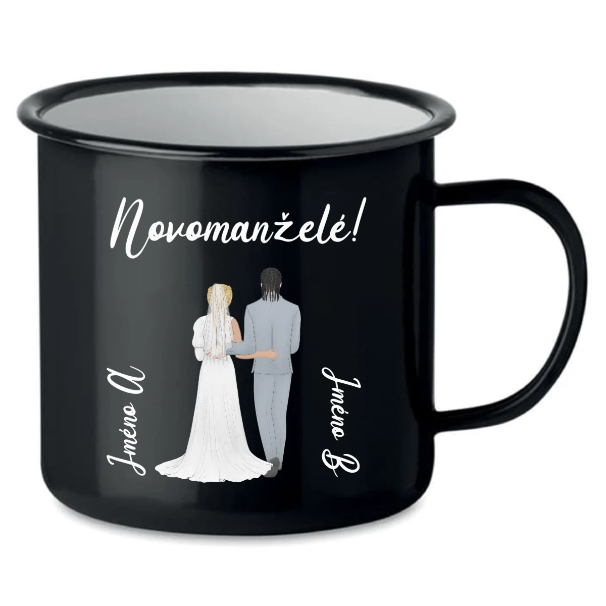 👰🤵 Na hrneček si můžete zvolit jakýkoliv nápis, například „Novomanželé“ a pod ním roztomilý svatební pár, který si sami přizpůsobíte:
