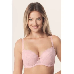 Biustonosz full cup Petra BF25 to elegancka i komfortowa propozycja dla kobiet ceniących doskonałe podtrzymanie oraz subtelny, kobiecy design. Miseczki wykonane z delikatnej, różowej koronki pięknie układają się na biuście, nadając całości lekkości i romantycznego charakteru. Od wewnętrznej strony zastosowano miękką bawełnę, która zwiększa komfort noszenia i zapewnia przyjemne uczucie przez cały dzień. Konstrukcja full cup gwarantuje pełne zabudowanie oraz stabilne podtrzymanie biustu, również przy większych rozmiarach. Wyjmowane wkładki push-up umożliwiają regulację efektu modelowania – możesz dopasować poziom uniesienia do własnych preferencji. Boki wzmocnione pionową fiszbiną dodatkowo stabilizują obwód i zapobiegają przesuwaniu się biustonosza. Nieodpinane, regulowane ramiączka zapewniają indywidualne dopasowanie, a sprawdzona konstrukcja BF25 odpowiada za wygodę i estetyczne ułożenie biustu. Skład (63% poliamid, 24% bawełna, 13% elastan) gwarantuje trwało