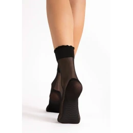 Ponožky Pico Massage 20 denier od spoločnosti Fiore sú elegantným a funkčným doplnkom, ktorý spája štýl s pohodlím. Priehľadný materiál zdôrazňuje mäkkosť a ľahkosť, zatiaľ čo jemný volánik na leme dodáva šarmantný nádych. Inovatívna podrážka s masážnym efektom podporuje pohodlie pri nosení a poskytuje chodidlám jemnú stimuláciu pri každom kroku. Zosilnená päta a špička zvyšujú odolnosť výrobku, takže je ideálnou voľbou na každodenné nosenie a špeciálne príležitosti.