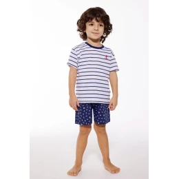 Klasické chlapčenské pyžamo s krátkym rukávom z bavlny, pruhované tričko, okrúhly výstrih, vzorované krátke šortky. Pyžamo v krabici.