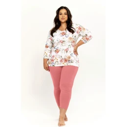 Dámské pyžamo s 3/4 délkou rukávů z jemné bavlny. 3/4 délka halenky, výstřih. 3/4 délky pevné kalhoty do kompletu.