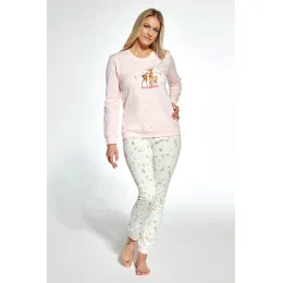 Dámske pyžamo z kvalitnej mäkkej bavlny. Tričko s dlhými rukávmi s farebnou potlačou na prednej strane, dlhé vzorované nohavice. Výstrih, manžety a spodná časť trička a nohavíc sú zakončené príjemným rebrovaním.