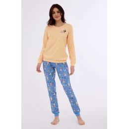 Dámske pyžamo z jemnej bavlny. Blúzka s dlhými rukávmi a rebrovanými manžetami, okrúhly výstrih, jemná potlač na hrudi, vzorované dlhé nohavice s rebrovanými manžetami, balené v krabici.