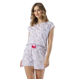 Dámské pyžamo s krátkým rukávem, vyrobené z bavlny s drobnými květy, kulatý výstřih, krátké šortky, ozdobná mašle ve výstřihu.