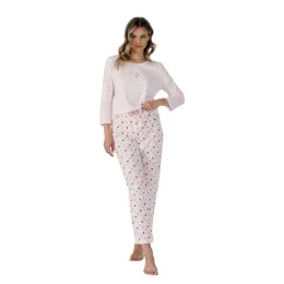 Dámské pyžamo s rukávy o délce 7/8, kulatým výstřihem, přední díl zdobený barevným potiskem. 7/8 dlouhé vzorované kalhoty. Ozdobná mašle v pase.