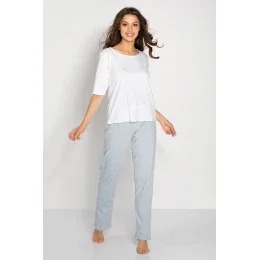 Tieto dámske pyžamá sú kombináciou elegancie, pohodlia a kvality. Bola navrhnutá a ušitá v Poľsku, čo zaručuje najvyššiu kvalitu spracovania. Výstrih do U dodáva pyžamu jemnosť a ženský pôvab. Jemné farby a nenápadný dizajn z nej robia ideálnu voľbu na každodenné nosenie a špeciálne príležitosti. Materiál tohto pyžama je mimoriadne mäkký a priedušný, umožňuje pokožke dýchať a zaisťuje maximálne pohodlie. Tričko a nohavice sú pohodlné a priedušné, takže môžete pokojne spať celú noc. Nohavice sú dlhé, nadrozmerné a majú elastický pás pre voľnosť pohybu a pohodlie. Pyžamo je tiež vyrobené z prírodných materiálov, ktoré sú šetrné k pokožke. Ide o dvojdielnu súpravu, ktorá spája elegantný strih s kvalitným spracovaním. Tento pyžamový komplet je ideálny pre ženy, ktoré oceňujú eleganciu a pohodlie.
