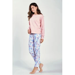 Dámské pyžamo s dlouhými rukávy ze silného pevného bavlněného interlooku, kulatý výstřih. Vzorované kalhoty s rovnými nohavicemi, v pase pohodlná guma.