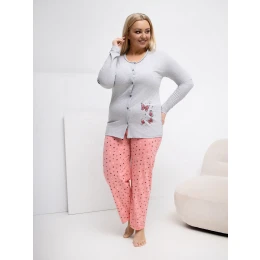 Wymiary piżamy w rozmiarze XL mierzone na płasko: bluzka: szerokość pod pachami - 54 cm, długość rękawa - 62 cm, długość całkowita - 74 cm, szerokość na dole - 52 cm, spodnie: szerokość w pasie - 33 cm (na płasko), szerokość w pasie - 72 cm (po rozciągnięciu), szerokość w biodrach - 57 cm, długość całkowita - 99 cm.