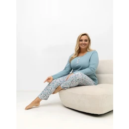Wymiary piżamy w rozmiarze XL mierzone na płasko: bluzka: szerokość pod pachami - 56 cm, długość rękawa - 59 cm, długość całkowita - 69 cm, szerokość na dole - 56 cm, spodnie: szerokość w pasie - 32 cm (na płasko), szerokość w pasie - 68 cm (po rozciągnięciu), szerokość w biodrach - 56 cm, długość całkowita - 101 cm.