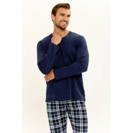 Pánské pyžamo s dlouhými rukávy, jednořadové, s výstřihem, dlouhé kostkované kalhoty s rovnými nohavicemi.