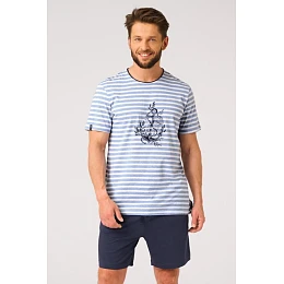 Štýlové a pohodlné pánske pyžamo ideálne na jarno-letnú sezónu. Vrchný diel v klasickom modro-bielom pruhu bol v strede ozdobený jemnou námorníckou potlačou, ktorá celku dodáva slávnostný nádych. Tričko s krátkymi rukávmi a okrúhlym výstrihom zaručuje voľnosť pohybu a pohodlie pri nosení.