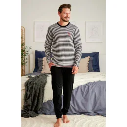 Pánske pyžamo z kvalitnej mäkkej bavlny. Pruhované tričko s dlhými rukávmi a potlačou na hrudi. Dopĺňajú ich dlhé pevné nohavice so šnúrkami na nohaviciach a vreckami.