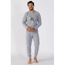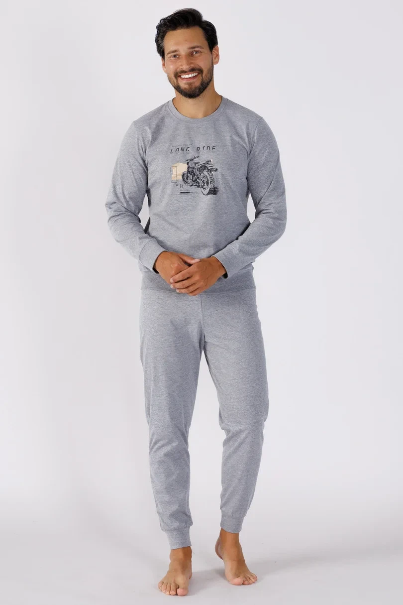 Panské pyžamo z kvalitnej, mäkkej, melírovanej bavlny, tričko s dlhým rukávom a potlačou na prednej strane, dlhé hladké nohavice s výstrihom, manžetami a spodným lemom s pohodlnou šnúrkou.