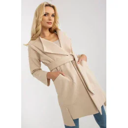 Tenký dámsky kabát s dlhými rukávmi, bez podšívky. Kabát bez zapínania, s pásikom na zaviazanie. Veľké vrecká na bokoch.