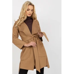 Tenký dámsky kabát s dlhými rukávmi, bez podšívky. Kabát bez zapínania, s pásikom na zaviazanie. Veľké vrecká na bokoch.