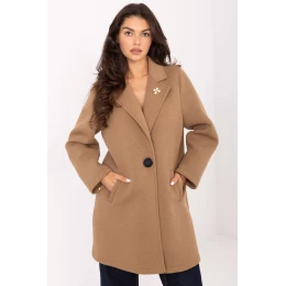 Elegantný dámsky kabát z modernej penovej tkaniny, ideálny na prechodné obdobia jesene, zimy a jari. Je vyrobený z polyesteru, viskózy a elastanu, zaujme hladkou štruktúrou a odolnosťou. Model štandardnej dĺžky s golierom, zapínaním na gombíky, dlhými rukávmi a praktickými vreckami. Štýlovým doplnkom je ozdobná brošňa na golieri, ktorá celku dodáva jedinečný charakter. Ľahký a nezateplený kabát sa dokonale hodí do každodenného aj pracovného štýlu.