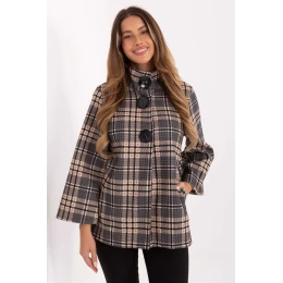 Elegantný a nadčasový dámsky kabát v károvanom vzore, ktorý je dokonalou kombináciou elegancie a klasického dizajnu. Je vyrobený z vysokokvalitného polyesteru, je ľahký, príjemný na dotyk a dokonale sa hodí do každodennej štylizácie. Model štandardnej dĺžky s jednoduchým strihom krásne sedí na postave, poskytuje pohodlie a voľnosť pohybu. Veľké zapínanie na gombíky dodáva celku charakter a zdôrazňuje klasický štýl kabátu. Stojatý golier chráni pred chladom a vrecká sú praktickým a elegantným zakončením. Tento elegantný kabát v károvanom vzore je ideálnou voľbou na chladnejšie dni, dokonale sa hodí do mestských aj sofistikovaných kombinácií.