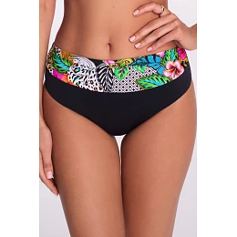 Spodný diel plaviek SF 237/3 Royal Wild od spoločnosti AVA Swimwear je ideálnou voľbou pre ženy, ktoré chcú klasický strih s moderným exotickým nádychom. Model plnšieho strihu sa dokonale prispôsobí telu a poskytuje pohodlie a istotu pri opaľovaní a vo vode. Široký vzorovaný pás s tropicko-geometrickou potlačou krásne zvýrazňuje pás a dodáva osobitý štýl, zatiaľ čo hladký čierny spodný diel opticky zoštíhľuje boky. Elastická, rýchloschnúca tkanina zaručuje pohodlie a odolnosť počas mnohých sezón. Spodný diel plaviek SF 237/3 sa dokonale kombinuje s podprsenkami Royal Wild a vytvára kompletný, výrazný plážový komplet.