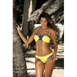 Jedinečné dvoudílné plavky, ve kterých se budete cítit skvěle. Dokonale tvaruje prsa. Podprsenka má vyztužené košíčky obohacené kosticemi a push-up vycpávkami (jsou součástí modelu). Skvěle zvedá prsa, tlačí je nahoru a zvětšuje je. Lemování je širší a stylové, zdobí výstřih a zajímavě se kříží uprostřed podprsenky. Popruhy jsou nastavitelné a plně odnímatelné. Obvod se zapíná sponou. Kalhotky opticky prodlužují nohy díky vsadkám z kontrastní látky. Jsou pružné, podšité a neprosvítají. Celé to vypadá prostě báječně!