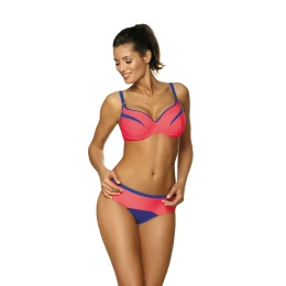 Opravdová lahůdka. Diagonální vsadky na košíčcích, lehce sportovní design, skvělý střih a barvy, které na vás okamžitě dýchnou atmosféru léta. Pokud hledáte něco módního a pohodlného, jste na správném místě. Profesionálně vymodelované košíčky, vyztužené, v dolní části obohacené kosticemi. Skvěle sbírají, zvedají, drží na místě a správně tvarují poprsí. Vytvářejí pěkný výstřih. Košíčky C a D mají navíc mírný push-up nárůst, který zlepšuje tělesné proporce. Ostatní šálky (E až H) jsou bez push up. Ramínka jsou délkově nastavitelná, obvod dobře drží, jsou pružná a pohodlně se zapínají přezkou.
