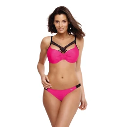 Je barevný, sexy, ženský a módní. Push-up podprsenka s vyztuženými košíčky a kosticemi, která profesionálně stahuje, tvaruje a opticky zvětšuje prsa. Dodává důvěru. Design je určen pro malé a střední poprsí, protože jim nejlépe vyhovuje. Push-up není z modelu odnímatelný a dodává se v každé velikosti plavek. Výstřih zdobený zajímavými černými elastickými pásky vypadá skvěle. Obvod pohodlně zavázaný na zádech, nastavitelná ramínka. Hladké kalhotky s elastickými pásky na bocích dělají nohy fenomenální a celou siluetu jednoduše nádhernou. Složení: 80 % polyamid, 20 % elastan.
