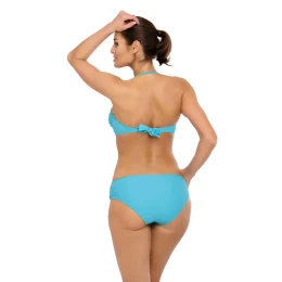 Podprsenka v tzv. "podprsenkovém" designu. "Bandeau", má vyztužené košíčky (bez push-up) obohacené kosticemi, takže pěkně tvaruje linii dekoltu a udržuje prsa ve správné poloze. Střih pěkně shrnuje poprsí, což se skvěle hodí na pláž. Popruh přes krk, odnímatelný. Kostým má elastický lem se zavazováním na zádech. Kalhotky jsou velmi pohodlné, vpředu s ozdobným páskem, zdobeným šperkem. Kostým je celý ušitý z vysoce kvalitní italské látky a působí velmi elegantně. Vyberte si ji a dovolená bude jistě úspěšná! Složení: 80 % polyamid, 20 % elastan.