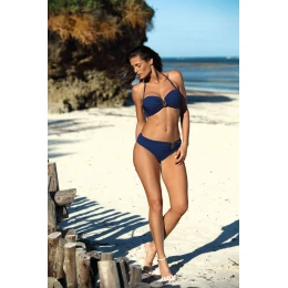 Podprsenka typu bandeau má vystužené košíčky (bez push-up efektu) a košíčky s kosticami, ktoré tvarujú dekolt a udržiavajú prsia v správnej polohe. Ramienko za krk je odnímateľné. Plavky majú elastický pás so zaväzovaním na chrbte. Spodný diel je veľmi pohodlný a vpredu ho zdobí opasok s drahokamami. Plavky sú vyrobené z kvalitnej talianskej tkaniny, vďaka ktorej sú veľmi elegantné. Vyberte si ich a určite budete mať úspešnú dovolenku! Zloženie: 80 % polyamid, 20 % elastan.