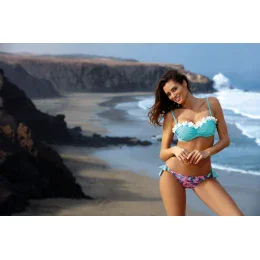 Propozycja dla pań, które marzą o dużych, jędrnych, seksownych piersiach, pięknie zebranych w dekolcie. Biustonosz wyróżnia się wspaniałą konstrukcją, przewidzianą na mniejsze i średnie piersi - jest usztywniany i posiada dość duże wypełnienie push up, umieszczone na stałe w biustonoszu. Umożliwia spektakularne wypchnięcie piersi ku górze, ich wymodelowanie i optyczne powiększenie, co zresztą widać na zdjęciu. Zastosowanie kwiecistej, delikatnej lamówki u góry, dodatkowo zwraca uwagę na pięknie wymodelowany dekolt. Ramiączka o regulowanej długości, odpinane, idealne sprawdzą się podczas opalania. Obwód wiązany na plecach. Figi to wzorzyste, wiązane po bokach brazyliany. Dla uzyskania pełnego efektu należy je mocno pociągnąć ku górze, aby ich trójkątny kształt ładnie ozdobił pupę, która częściowo wysuwa się poza kontur fig.
