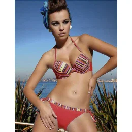 Dvojdielne plavky určené pre malé a stredné poprsie, s podprsenkou s kosticami a šortkami v cene. Vzorované v dovolenkových farbách v sorbetovej farbe v hornej časti a hladké v spodnej časti. Podprsenka s funkciou vyberania pŕs na bokoch, vrátane push-up (odnímateľná z modelu). Ramienka bez ramienok, zapínanie na leme. Šortky s ozdobným lemovaním v hornej časti. Taliansky elastický materiál. Zloženie: 82 % polyamid, 18 % elastan.