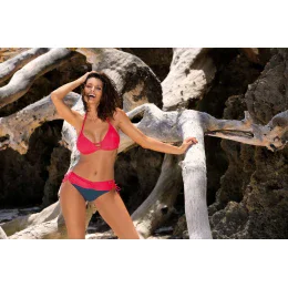 Podprsenka s košíčky vyztuženými jemnou pěnou, s push-upkou trvale umístěnou v modelu (nelze ji vyjmout), krásně shromažďuje prsa, přibližuje je k sobě a opticky je zvětšuje, čímž najednou vytváří hluboký, smyslný dekolt. Pruhy uprostřed tento sexy dojem ještě umocňují. Push-up se dodává ve všech modelových velikostech. Podprsenka se zavazuje za krkem i na zádech. Doplněno kalhotkami s ozdobnými vázačkami na bocích, tradičně vsazenými (vázačky jsou ozdobným prvkem). Elegantní barevné provedení, které se skvěle hodí k letnímu klimatu. Složení: 80 % polyamid, 20 % elastan.