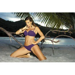 Luxusné plavky v krásnej farbe, s nastaviteľnými a odnímateľnými ramienkami (umožňujúcimi rovnomerné opálenie), zdobené zirkónmi, ktoré sa elegantne lesknú. Skutočný šmrnc, ktorý si na pláži určite všimnete... Jeden z najlepších modelov tejto sezóny. Podprsenka má balkónový strih (bardotka), ktorý dokonale zvýrazní krásu ženského tela. Košíčky s kosticami účinne nadvihujú prsia a výstižne ich zvýrazňujú. Okrem toho súprava (od veľkosti S do XL) obsahuje (odnímateľné) push-up košíčky, ktoré, ak sa ponechajú v modeli, sexi zväčšia prsia. Podprsenka sa zapína vzadu na sponu.