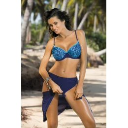 Tieto dvojdielne plavky sú určené pre ženy s veľkými, plnými prsiami. podprsenka je vystužená penou, prsia nezväčšuje, ale približuje ich k sebe a pekne tvaruje. košíčky sú hlboké a dobre stavané, zbierajú a podporujú prsia. podprsenka je podšitá a zapína sa na pracku. vzorovaná látka dodáva charakter. ramienka sú nastaviteľné. súčasťou súpravy sú aj plnšie nohavičky s praktickým zaväzovaním na boku, vďaka ktorému ich ľahko zmeníte na šortky alebo klasické nohavičky. sú vyrobené z hladkej látky, neprekrývajú sa. tvarujú bruško a zadoček.