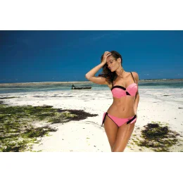 Jedny z nejkrásnějších dvoudílných plavek z této kolekce. Krásné, ženské, elegantní... Podprsenka s překrytým výstřihem, uprostřed zdobená krásnou broží. Vypadá obzvlášť dobře, zejména proto, že výrobce navrhl velmi svůdnou konstrukci. Její košíčky byly vhodně vyztuženy, vyztuženy velrybími kosticemi a obohaceny kapsičkami pro přiložené push-up košíčky - dokonale sbírají prsa, zvedají je a přiměřeně zvětšují. Vytvářejí fenomenální dekolt. Ramínka jsou odepínací, délkově nastavitelná, ideální na opalování. V pase se pohodlně zapínají vzadu na přezku. Kalhotky jsou hladké, na bocích zavazovací. Vřele doporučujeme!