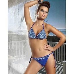 Roztomilé puntíky a sexy střih - to jsou bikiny Kelly. Konstrukce podprsenky je založena na tvarovaných, vyztužených košíčcích (bez push-up), jejichž obvod a ramínka se pohodlně zavazují. Model pěkně shrnuje a zvýrazňuje prsa ve výstřihu. Puntíky jsou krásný vzor a v duetu s prázdninovou barevností vypadají skvěle. Kalhotky zavázané na bocích. Složení: 82 % polyamid, 18 % elastan.