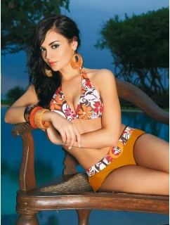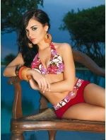 Tieto pohodlné dvojdielne plavky sú vyrobené z kvalitnej talianskej mäkkej tkaniny a zdobené malebnými kvetmi. Podprsenka v bikinovom štýle má vystužené košíčky, ktoré sa dajú vybrať a vytvoriť tak mäkkú štruktúru košíčkov. Podprsenka krásne a prirodzene zvýrazňuje tvar pŕs, zmyselne ich zaobľuje a jemne odhaľuje. Zaväzuje sa v páse a na ramienkach. Šortky sú hladké s ozdobným pásikom. 80 % polyamid, 20 % elastan.