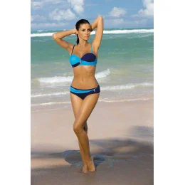 Oto kostium kąpielowy, który doda Ci seksapilu i wdzięku! Biustonosz posiada usztywniane miseczki, które doskonale unoszą, modelują i podtrzymują piersi. Do rozmiarów S, M, L, XL dodawane są poduszeczki push up, (można je wyjąć), które dodatkowo optycznie powiększają biust.Biustonosz otulono dwukolorową tkaniną o wysokiej jakości, dzięki temu kostium ładnie współgra z opalenizną. Pośrodku umieszczono elegancką, pozłacaną broszkę. Biustonosz posiada fiszbiny dolne oraz boczne, zapinany jest na klamerkę. Atutem są regulowane ramiączka, które można odpiąć w razie potrzeby.W zestawie finezyjne majteczki, ozdobione z przodu dwukolorowym a’la paseczkiem z ozdobną broszką. Figi posiadają gładki tył, nie prześwitują i dobrze przylegają do ciała.