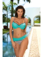 Je vyroben z kvalitní italské látky a zaujme hladkou push-up podprsenkou, která smyslně tvaruje a zvětšuje ňadra a vytváří svůdný plážový dekolt. Push-up je k dispozici v každé velikosti plavek a není vyjímatelný. Košíčky s kosticemi jsou zevnitř vyplněny speciální push-up pěnou (k dispozici v každé velikosti plavek a není vyjímatelná z podprsenky). Umožňuje dosáhnout plného, ženského poprsí s maximálně přirozeným vzhledem. Ozdobná ramínka (pruhovaná) navazují na kalhotky. V pase se zavazují na zádech. Kalhotky půvabně zdobí boky a jejich zadní část lehce odkazuje na v současnosti módní brazilský střih. Edice "Sweet & Sexy", rozhodně doporučujeme! Složení: 80 % polyamid, 20 % elastan.