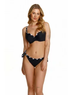Biustonosz z kwiecistą lamówką przy dekolcie, wygląda romantycznie i sexy. Każdy kwiatuszek posiada mały, perłowy koralik umieszczony po środku. Fason jak przystało na producenta zakochanego w mega kobiecym Looku - daje z siebie wszystko, abyś na plaży wyglądała pięknie. Miseczki usztywniane, z fiszbinami i dużym wypełnieniem push up, umieszczonym na stałe w modelu. Świetnie unosi, modeluje i optycznie powiększa piersi. Konstrukcja przewidziana na małe i średnie biusty. Push up bez możliwości wyjęcia, dostępny w rozmiarach S, M, L, XL, XXL. Obwód wiązany na plecach. Ramiączka z możliwością odpięcia, o regulowanej długości. Figi o kroju brazylijskim, seksownie zdobią biodra. Aby uzyskać zamierzony efekt należy je mocno pociągnąć ku górze bioder. Boki wiązane po obu stronach.