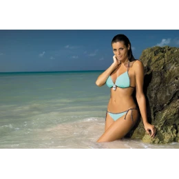 Prześliczne bikini w letnim kolorze, który wspaniale współgra z opalenizną. Biustonosz to tradycyjne trójkąty na sznureczkach. Dół miseczek delikatnie marszczony. Zewnętrzna krawędź biustonosza obszyta została lamówką w paseczki. Uroku dodaje umieszczona między miseczkami kokieteryjna broszka ozdobiona białą tkaniną w czarne groszki. Miseczki są usztywnione, doskonale wyprofilowane i zapewniają pełen komfort noszenia.W zestawie majteczki wiązane na biodrach. Przód miętowy, utrzymany w pastelowej tonacji. Tył gładki.• produkt najwyższej jakości, potwierdzony hologramem,• uszyty z włoskiej tkaniny Carvico Tessuti,• odporny na działanie promieni słonecznych i siłę trącą piasku,• doskonale kryjący ciało,• szybkoschnący.